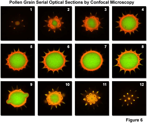 In specimens more complex than a pollen grain, complex interconnected structural elements can be difficult to discern from a large series of optical sections sequentially acquired through the volume of a specimen with a laser scanning confocal microscope. However, once an adequate series of optical sections has been gathered, it can be further processed into a three-dimensional representation of the specimen using volume-rendering computational techniques. This approach is now in common use to help elucidate the numerous interrelationships between structure and function of cells and tissues in biological investigations. In order to ensure that adequate data is collected to produce a representative volume image, the optical sections should be recorded at the appropriate axial (z-step) intervals so that the actual depth of the specimen is reflected in the image. Most of the software packages accompanying commercial confocal instruments are capable of generating composite and multi-dimensional views of optical section data acquired from z-series image stacks. The three-dimensional software packages can be employed to create either a single three-dimensional representation of the specimen (Figure 7) or a video (movie) sequence compiled from different views of the specimen volume. These sequences often mimic the effect of rotation or similar spatial transformation that enhances the appreciation of the specimen's three-dimensional character. In addition, many software packages enable investigators to conduct measurements of length, volume, and depth, and specific parameters of the images, such as opacity, can be interactively altered to reveal internal structures of interest at differing levels within the specimen. Typical three-dimensional representations of several specimens examined by serial optical sectioning are presented in Figure 7. The pollen grain optical sections illustrated in Figures 1 and 6 were combined to produce a realistic view of the exterior surface (Figure 7(a)) as it might appear if being examined by a scanning electron microscope. The algorithm utilized to construct the three-dimensional model enables the user to rotate the pollen grain through 360 degrees for examination. The tissue culture cells in Figure 7(b) are derived from the Chinese hamster ovary (CHO) line and were transfected with a chimeric plasmid vector containing the green fluorescent protein and a human immunodeficiency virus (HIV) protein that is expressed in the nucleus (thus, labeling the nuclear region). Thick tissue sections are also easily viewed in three-dimensions constructed from optical sections. The mouse intestine section illustrated in Figure 7(c) was labeled with several fluorophores and created from a stack of 45 optical sections.