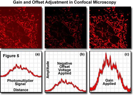 In modern commercial confocal microscopes, the photomultiplier is located within the scan head or an external housing, and the gain, offset, and dynode voltage are controlled by the computer software interface to the detector power supply and supporting electronics. The voltage setting is used to regulate the overall sensitivity of the photomultiplier, and can be adjusted independently of the gain and offset values. The latter two controls are utilized to adjust the image intensity values to ensure that the maximum number of gray levels is included in the output signal of the photomultiplier. Offset adds a positive or negative voltage to the output signal, and should be adjusted so that the lowest signals are near the photomultiplier detection threshold. The gain circuit multiplies the output voltage by a constant factor so that the maximum signal values can be stretched to a point just below saturation. In practice, offset should be applied first before adjusting the photomultiplier gain. After the signal has been processed by the analog-to-digital converter, it is stored in a frame buffer and ultimately displayed on the monitor in a series of gray levels ranging from black (no signal) to white (saturation). Photomultipliers with a dynamic range of 10 or 12 bits are capable of displaying 1024 or 4096 gray levels, respectively. Accompanying image files also have the same number of gray levels. However, the photomultipliers used in a majority of the commercial confocal microscopes have a dynamic range limited to 8 bits or 256 gray levels, which in most cases, is adequate for handling the typical number of photons scanned per pixel.