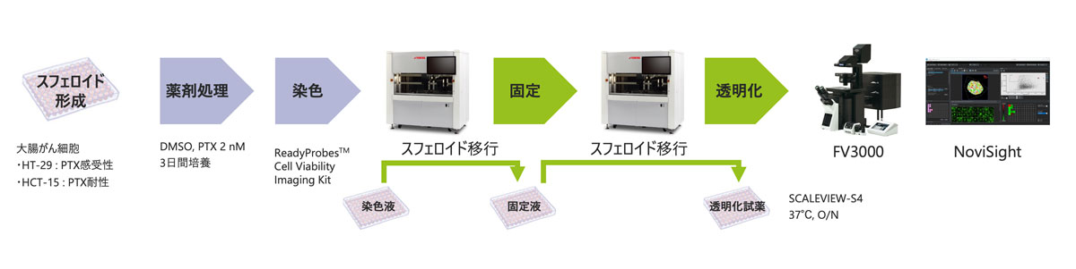 しかし、多数のサンプルを作製・染色・画像取得・3次元解析には多大な時間がかかります。このワークフローを簡便にするため、我々は、YAMAHA CELL HANDLER™によるスフェロイド作製・固定・染色の自動化、FV3000とNoviSight™による画像取得・3次元解析の自動化を行いました。