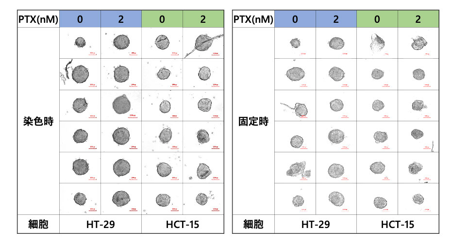 超低接着U底プレートに直径100umのスフェロイド(HT-29, HCT-15)を作製し、パクリタキセル(PTX) 2 nMまたはDMSOを添加しました。3日間の培養後、スフェロイドをReadyProbes™ Cell Viability Imaging Kitで染色し、固定液の入ったプレートに移し4℃ で一晩処理しました。その後、SCALEVIEW-S4に移し、37℃で一晩処理しました。サンプルの移動はすべてYAMAHA CELL HANDLER™で実施しました。