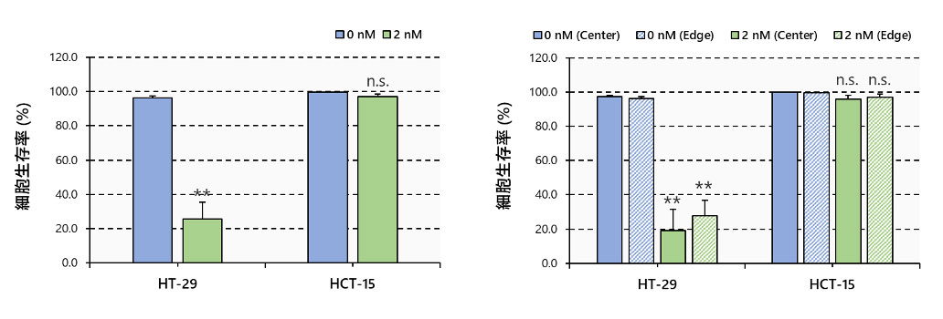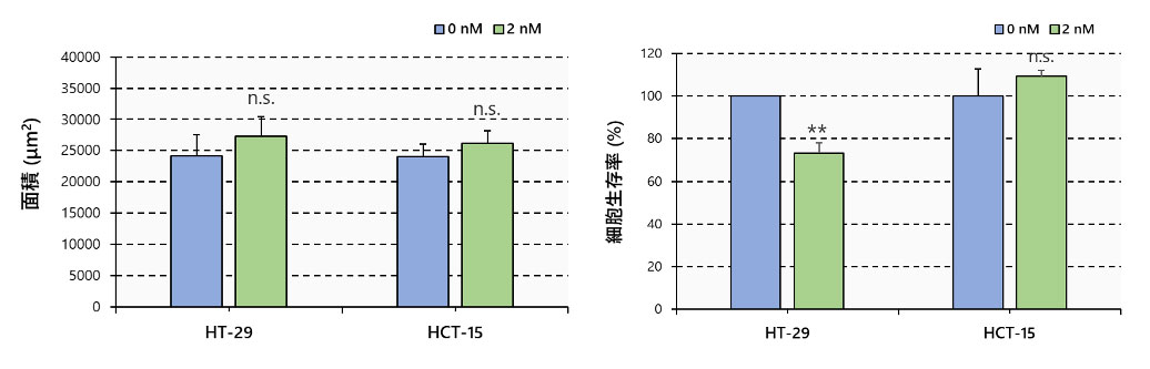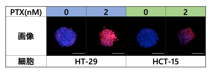 また、PTXで処理したスフェロイドとPTXで処理していないスフェロイドの間で、面積に差は見られませんでした。一方で、蛍光シグナルはPTXがHT-29の生細胞数を大きく減少させることを示し、HCT-15のスフェロイドでは生細胞の減少が見られませんでした(図2)。