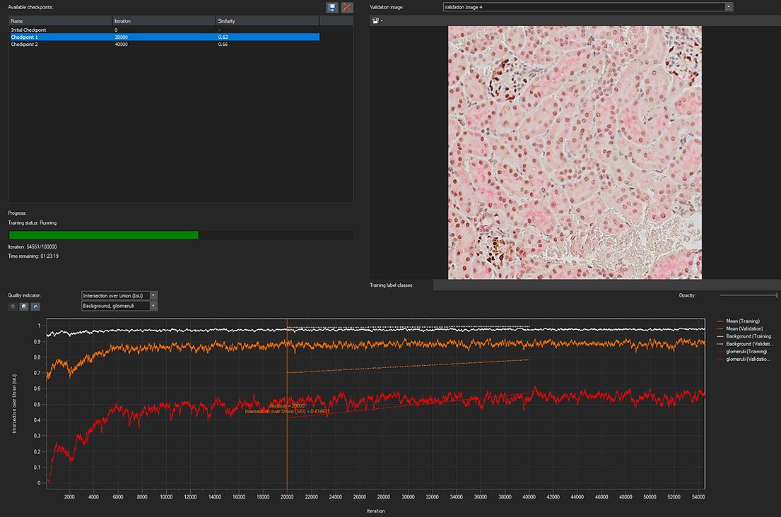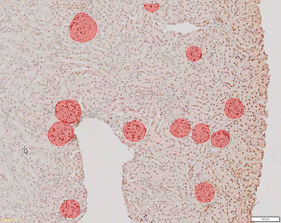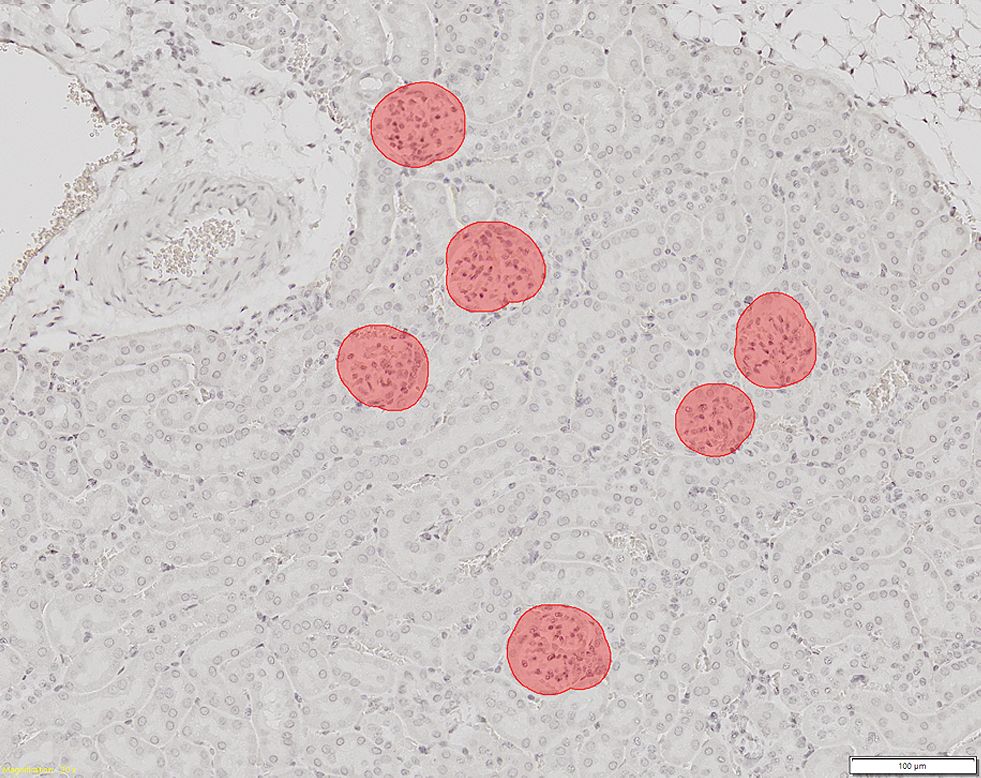 研究者が研究に関連するデータの取得のために、大量の画像を解析することがよくあります。 解析には定量的と定性的のどちらの場合もあり、信頼性が高く公平なものでなくてはなりません。 対象とする形態学領域によっては、作業は極めて面倒になる可能性があります。 プロセスを高速化するため、オリンパスでは、SLIDEVIEW™ VS200スキャナーと組み合わせたディープラーニングソリューションを提供しています。 以下の実験では、腎臓の糸球体の検出に、このスキャナーのセルフラーニング画像解析ソフトウェアモジュールが適用されました。