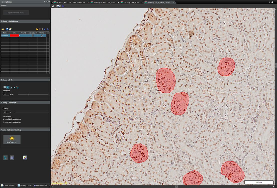 VS200スライドスキャンパッケージには、画像解析用のVS-Desktopソフトウェアが付属しています。 ソフトウェアにはTruAI™モジュールが組み込まれており、畳み込みニューラルネットワークに基づく検出とセグメンテーションにディープラーニング法を適用します。 畳み込みニューラルネットワークはセルフラーニング観察法の一種であり、オブジェクトセグメンテーションに用いられる極めて強力なテクノロジーです。 テクノロジーのおかげで、腎臓内の糸球体の検出を自動化できます。