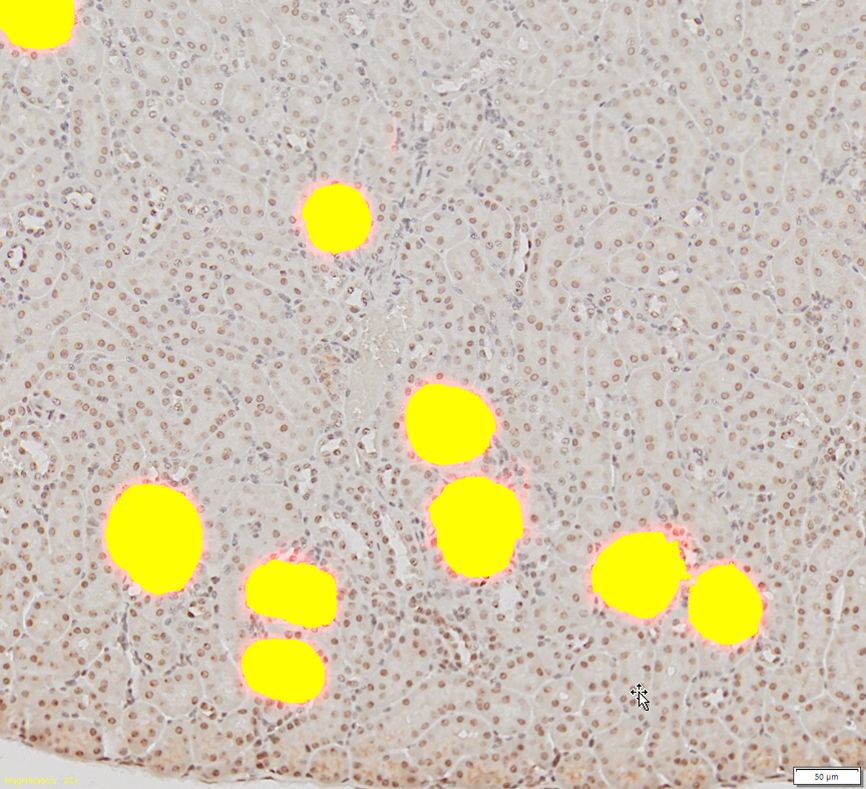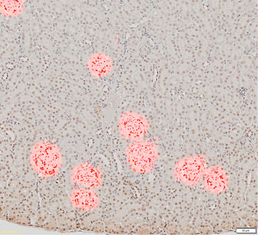 3. 検出された糸球体をセグメンテーションし、出力画像上で詳細なカウントおよび測定分析の実行に使用できます。