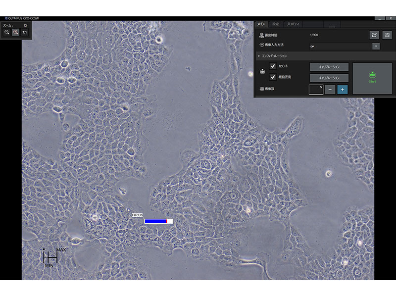![]() | 環境変化による細胞への影響を軽減培養細胞は温度や二酸化炭素濃度など、細胞にとって最適な環境に設定されたインキュベーター内で培養されます。細胞の状態を維持するため、観察や計測などのためにインキュベーターの外に持ち出して作業する際は、できるだけ時間をかけずに行う必要があります。CKX-CCSWはパラメータの設定や計測を簡単に行えるようGUIがデザインされており、大量の培養細胞を計測する場面でも素早く作業し、インキュベーターへ戻すことができます。 |