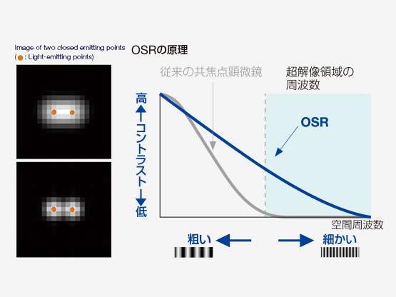 | 画像とは様々な空間周波数の集まりにより構成され、分解能が高い画像とは高い周波数成分を有していることを意味しています。共焦点光学系はボケ像を取り除き焦点面のみの情報を取り出すだけでなく、従来の分解能を超える超解像領域の周波数を検出できますが、この超解像領域のコントラストは低く、可視化することが困難でした。Olympus Super Resolution(OSR)技術は、超解像領域をできるだけ画像の中に取り込むために光学系を最適化すると同時に、コントラストの低い超解像領域を本来のコントラストに高速に回復させるオリンパス独自のオプトエレクトロニクス技術により、水平分解能120nmを実現することができます。そのため、特別な蛍光色素を必要とせず、従来の蛍光色素が使用できるため、マルチカラーの超解像イメージングが手軽に実現できます。 |