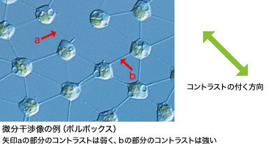 無色透明のサンプルや生きている細胞などに適した観察方法としては、位相差観察のほかに、微分干渉観察(Differential Interference Contrast ; DIC)があります。