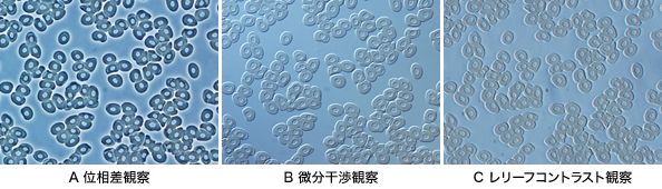 下の図1をご覧ください。こちらはカエルの血球標本を位相差、微分干渉、レリーフコントラストの3つの観察方法で撮り比べたものです。