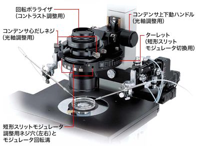レリーフコントラスト観察を行うには、専用コンデンサと専用対物レンズが必要です。