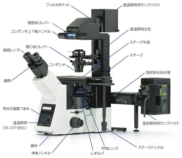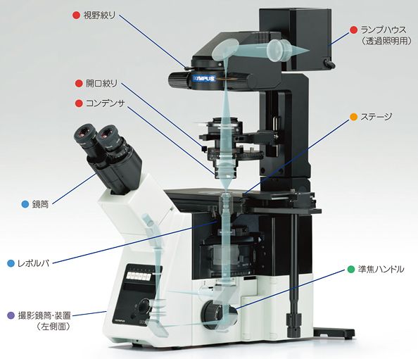 光学系とは、光の性質を利用して物体の像をつくる機能のまとまりです。レンズ、ランプ、反射ミラーなどの組み合わせで構成されています。顕微鏡の基本機能 と構成は次のとおりです。これら基本機能の中で特に基本となる顕微鏡の光学系は、対物レンズ、接眼レンズ、照明系(コンデンサ、絞り、光源、フィルタ)、 鏡筒の4つです。