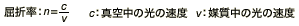 屈折率とは、光が真空中を進む速度とガラスなどの媒質中を進む速度の比率のことである。