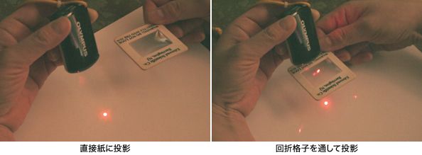 回折格子(ガラス板に多数の細いすきまを平行に等間隔に刻んだもの)にレーザーポインターで光を当てると、格子を通った光はいくつにも広がっ