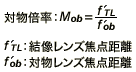 顕微鏡のレンズは、対物レンズによってつくられる倒立の実像(中間像または一次拡大像と呼ぶ)を、接眼レンズでさらに拡大している。観察者は、この接眼レンズで拡大された虚像を見ていることになる。 このように、顕微鏡では、対物レンズで拡大された像をさらに接眼レンズで拡大するので、顕微鏡の総合倍率は、対物レンズの倍率と接眼レンズの倍率を掛け合 わせて求められる。たとえば、対物レンズ40倍と接眼レンズ10倍を使用して観察した場合、顕微鏡の総合倍率は400倍となる。 | ![]() 図10 顕微鏡の結像のしくみ |