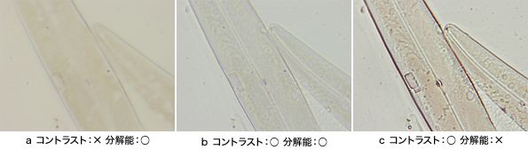 像を観察するには、分解能や倍率だけでは見えず、適度なコントラストが必要である。