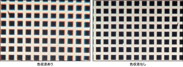3色(赤・青・紫)の色収差と像面湾曲収差を補正したもの。