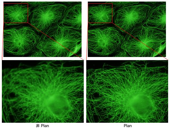 下の写真は、培養細胞(PtK2)の微小管を「補正済の対物レンズ(Plan)」とそうでない対物レンズで撮り比べたものです。ご覧いただくと、Plan補正がかかっている右の写真の方が、画面の端までシャープな画像になっているのがおわかりいただけると思います。