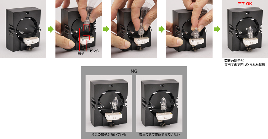 ガーゼなどでランプを包んで持ち、端子をランプソケットのピン穴に真っ直ぐに(傾けない)突当たるまで押込みます。(端子の両足がしっかり突き当たること)
