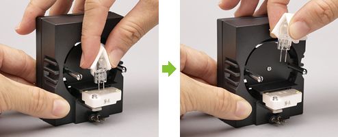 ※なお取り外す際は、決して無理に斜め方向に引き抜かないようにしてください。無理に斜め方向に引き抜こうとすると、ランプソケットのガイドピンがゆがんでしまい、再び顕微鏡の鏡体に装着できなくなる恐れがあります。