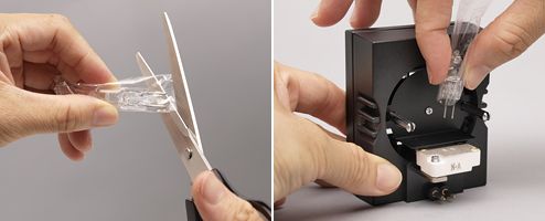 ランプには直接触れないようにします。ガーゼなどでランプを包んで持つか、もしくは新しいハロゲンランプは、ビニール袋に入っています。そのビニール袋の片側(ランプの端子側)を開けて、ビニールの上からランプを持つとスムーズな交換が可能です。(図4、図5を参照)