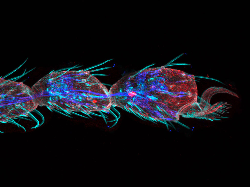 用鬼笔环肽(AlexaFluor 405,F-肌动蛋白,青色)、抗磷酸酪氨酸抗体(AlexaFluor 555,细胞表面,红色)和抗HRP抗体(AlexaFluor 647,轴突,蓝色)染色的果蝇腿尖。样品承蒙以下人员和机构提供:日本理化学研究所(RIKEN)生物系统动力学研究中心形态发生信号实验室的Zhengkuan Sun,Shigeo Hayashi。 |