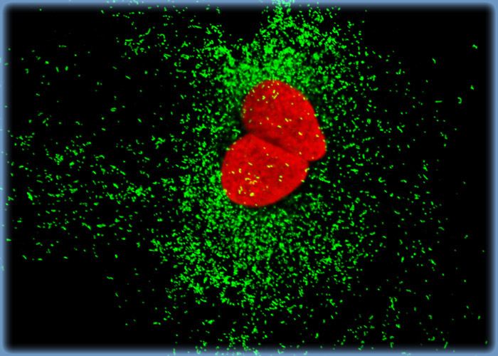 Nuclear histone proteins were targeted in the culture of 3T3 cells presented in this section with mouse anti-histone (pan) monoclonal antibodies, which were imaged with goat anti-mouse Fab fragments conjugated to Alexa Fluor 568 (labeling the nucleus). The specimen was simultaneously labeled for peroxisomes with Alexa Fluor 488 conjugated to goat secondary antibodies that target rabbit anti-PMP 70 (peroxisomal membrane protein 70).