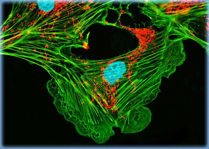 Filamentous actin was targeted in the culture of rat kangaroo kidney (PtK2) cells presented in this section with BODIPY FL conjugated to phallacidin, a bicyclic peptide derived from a toxic mushroom. In addition, the cells were treated with the mitochondrion-selective stain MitoTracker Red CMXRos and a nuclear counterstain, TO-PRO-3 (pseudocolored cyan).