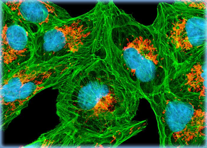 The adherent monolayer African green monkey kidney cell culture presented in this section was labeled for the cytoskeletal filamentous actin and intracellular mitochondrial networks with Alexa Fluor 488 conjugated to phalloidin and MitoTracker Red CMXRos, respectively. Nuclei present in the epithelial cells were counterstained with a carbocyanine monomer, TO-PRO-3 (pseudocolored cyan).