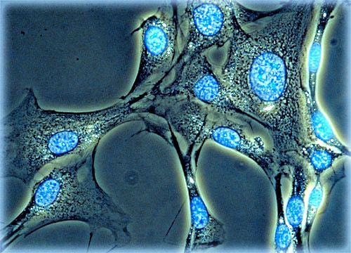 Nuclei of 3T3 cells grown in culture were stained with with the fluorophore DAPI and imaged utilizing a combination of fluorescence and phase contrast illumination.