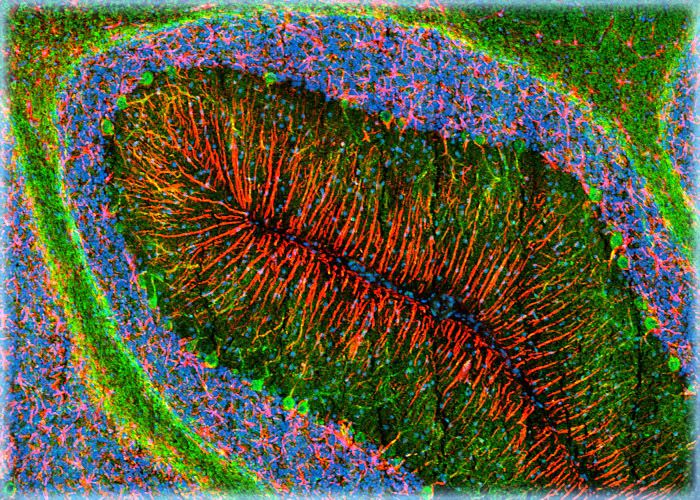 The cerebellum is located posterior to the brain stem to which it is connected via bundles of nerves and is separated from the cerebral cortex by an extension of the dura mater called the tentorium cerebelli. Similar to the cerebrum, the cerebellum is divided into two hemispheres as well as an outer mantle of gray matter (termed the cerebellar cortex) and an internal core of white matter, which contains four bilaterally paired nuclei (fastigial, globose, emboliform, and dentate nuclei).