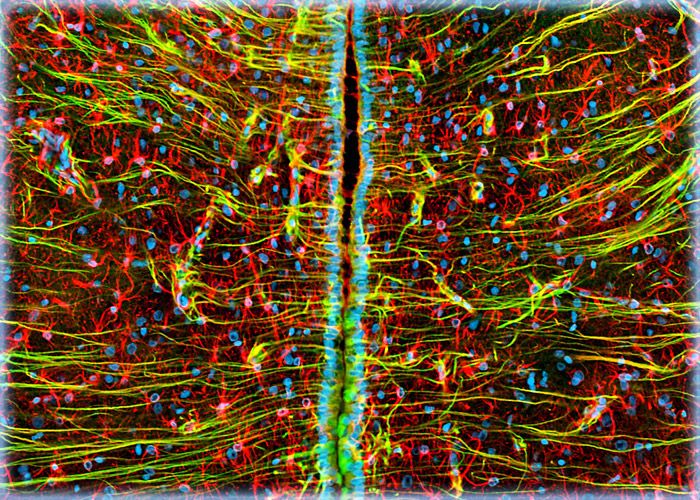 The ventricular system of the brain is comprised of several cavities and the narrow channels that connect them to one another. Contained within the system is the watery material known as cerebrospinal fluid, which provides mechanical protection to the brain and is central to the removal of potentially toxic metabolites from the organ.