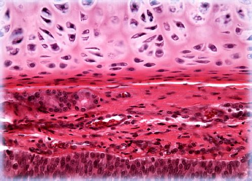 Cartilage is a tough, but elastic, connective tissue that chiefly comprises the skeletal structures of embryonic and young vertebrates. Sometimes referred to as gristle, the material, which is essentially comprised of a network of collagen fibers embedded in a gelatinous matrix and surrounded by a fibrous membrane called the perichondrium, is usually replaced by the bony skeleton as development proceeds.