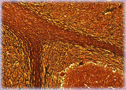 The cerebellum is part of the hindbrain located behind the pons. The lobed structure, which in humans is about the size of an adult fist, functions chiefly in the control of bodily movement and the development and recollection of physical skills, such as riding a bike or swimming.