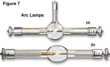 Arc Lamps - Mercury vapor, xenon and zirconium arc lamps are also useful sources of illumination for specialized forms of microscopy. These lamps are controlled by external power supplies that are designed to meet the electrical requirements of first igniting the lamp, then providing the correct current to maintain constant illumination. Several typical arc lamp designs are illustrated in Figure 7. The lamp in Figure 7(a) is a mercury vapor lamp equipped with an igniter electrode and the lamp in Figure 7(b) is a modern HBO 200 watt mercury short arc lamp powered with alternating current through an external power supply. This and other similar arc lamp power supplies will furnish enough start-up power to ignite the burner (by ionization of the gaseous vapor) and keep it burning with a minimum of flicker.