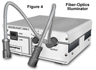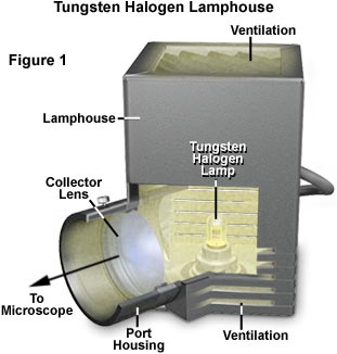 Microscopes not equipped with an internal source of illumination must resort to external light sources to provide illumination for the sample. A typical external illumination source is illustrated in Figure 6. These illuminators may contain a variety of incandescent tungsten lamps including both 6-12 volt DC lamps as well as 120 volt coil-filament lamps that sport power ratings from 25-100 watts.