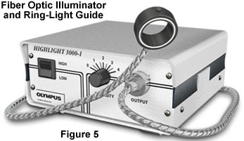 Also available are other peripheral components such as colored glass filters to produce special effects lighting and polarizers that attach to the lens elements to allow illumination with polarized light. These light sources are often used as auxiliary oblique illumination for reflected light microscopy with compound and stereo microscopes. Specially designed ring illuminators, as depicted in Figure 5, can be used to create a bright, 360° cool white, shadow-free even-intensity illumination. They are designed to mount directly to stereo microscope objectives and are useful even with high-magnification and long working distance (1.5 to 10 inches) objectives without light adjustment when refocusing or when zoom features are used. Polarizing units are manufactured for the ring-light guides so that light reflected back into the objective can be polarized. There are also glass and gelatin filter kits that can be used with these lighting attachments.
