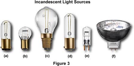 Tungsten lamps vary widely in their design and the diverse set of models offered by manufacturers feature a variety of envelope shapes, mounting fixtures, and filament arrangements. A typical selection of tungsten lamps used in optical microscopy is illustrated in Figure 3. The bulb in Figure 3(a) is a 6-12 volt square tungsten filament with a bronze bayonet base that is designed to be used with the end of the cylindrical bulb facing the collector lens. The rounded-envelope bulb illustrated in Figure 3(b) also has a bronze bayonet base, but this less-powerful 6 volt bulb can be positioned to project light either sideways or end-on. The bulb in Figure 3(c) also has a rounded envelope, but is equipped with an Edison screw-thread base. With an operating voltage between 6 and 30 volts, this bulb is designed to be used end-on.