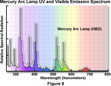 Arc lamps have an average lifetime of about 200 hours and most external power supplies are equipped with a timer that allows the microscopist to monitor how much time has elapsed. Mercury arc lamps (often referred to as "burners") range in wattage from 50 watts to 200 watts and consist usually of two electrodes sealed under high pressure in a quartz glass envelope which also contains mercury. These arc lamps do not provide even intensity across the spectrum from near-ultraviolet to infrared (see Figure 8 for the emission spectrum of the mercury arc lamp).