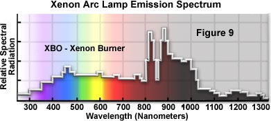 The xenon arc lamps have much more even intensity across the visible spectrum than do the mercury vapor lamps (see Figure 9); they do not have the very high spectral intensity peaks that are characteristic of the mercury lamps. Xenon lamps are deficient in the ultraviolet; they expend a large proportion of their intensity in the infrared, and therefore the use of such lamps requires care in control of heat. Short-gap xenon burners are usually more desirable because the size of the arc is such that its light may be much more readily included within the back aperture of the objective, thus avoiding waste of light intensity.