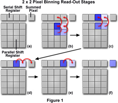 To illustrate this process, Figure 1(b) shows each integrated pixel in the parallel register stepping by an increment of one gate to yield the arrangement shown in Figure 1(c). Here, the electrons from two pixels remain in the parallel shift register, while those from the other two have been transferred to the serial shift register. Another step (Figure 1(c)), shifts the remaining electrons in the parallel shift register to fill the adjacent gate elements in the serial register (Figure 1(d)). The final steps involve shifting of charge from the serial register, two pixels at a time, to the summing pixel (Figure 1(d) and (e)). Figure 1(f) illustrates the combined charge of four pixels in the summing well awaiting transfer to the output amplifier, where the signal will be converted to a voltage and then transferred to other integrated circuits for further amplification and digitization. The process continues until the entire array has been read out. In this example, the area of four adjacent pixels has been combined into one larger pixel, sometimes referred to as a super pixel. The signal-to-noise ratio has been increased by a factor of four, but the image resolution is cut by 50 percent.