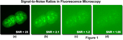 The effects of decreasing signal-to-noise ratio in fluorescence microscopy is illustrated by the series of digital images presented in Figure 1. The specimen is an adherent culture of opossum kidney proximal tubule epithelial cells (OK cell line) stained with SYTOX Green to image the nuclei. At high signal-to-noise ratios, a pair of interphase nuclei (Figure 1(a)) is imaged with sharp contrast and good definition of fine detail on a black background. As the signal-to-noise ratio decreases (Figures 1(b) and 1(c)), the definition and contrast of the nuclei also decrease until they almost completely blend into the noisy background (Figure 1(d)) as the SNR approaches unity.