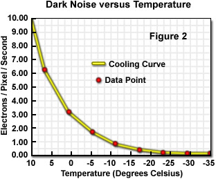 Various approaches are used to increase signal-to-noise ratio in high-performance CCD imaging systems. To reduce thermal charge generation within the semiconductor layers of the CCD, which is manifested as dark current, special device fabrication techniques and operation modes are sometimes employed. It is common to cool the CCD to reduce dark current to a negligible level using thermoelectric or cryogenic refrigeration, or if necessary, the extreme approach of liquid nitrogen cooling may be taken. In general, high-performance CCD sensors exhibit a one-half reduction in dark current for every 5 to 9 degrees Celsius as they are cooled below room temperature, a specification referred to as the doubling temperature. This rate of improvement typically continues to a temperature of approximately 5 to 10 degrees below zero, beyond which the reduction in dark current diminishes quickly (see Figure 2). In addition to specialized circuit and electronics design, filtration techniques utilizing advanced integrators and double sampling methods are sometimes undertaken to remove certain components of read noise.
