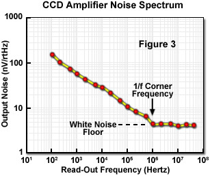 The second noise source attributed to the output amplifier is flicker noise, commonly referred to as 1/f noise because of its approximate inverse dependence on frequency. Many systems, both natural and manufactured, exhibit some form of 1/f behavior. With regard to CCD flicker noise, the significant frequency variable is the pixel read-out rate. For cameras in which pixels are read out at less than approximately 1 megahertz, and with a characteristic 1/f noise spectrum, the read noise floor is usually determined by 1/f noise. Figure 3 illustrates a typical CCD amplifier noise spectrum, plotting output noise as a function of read-out frequency. The reduction in noise as frequency increases is characteristic of a 1/f noise spectrum, exhibiting a decrease in noise by a factor of 3.16 for each decade increase in frequency. Note that the noise continues to decrease at this rate until it levels off, at a frequency referred to as the 1/f corner frequency. The stabilization of the noise level at higher frequencies indicates that the amplifier's white noise floor has been reached, and a pixel read-out rate greater than the 1/f corner frequency results in white noise limited operation. For the MOSFET amplifier producing the curve illustrated in Figure 3, the white noise floor occurs at approximately 4.5 nanovolts per root-hertz.