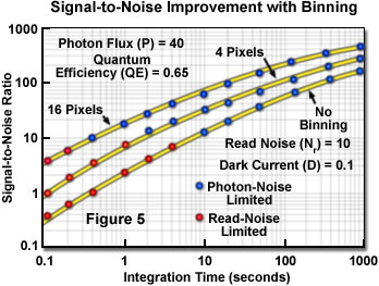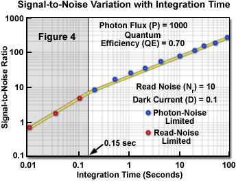 Figure 4 presents a plot of signal-to-noise ratio versus integration (exposure) time in a typical high-performance CCD camera designed for imaging at low signal levels, with photon flux and sensor characteristics fixed at the values shown in the figure. In a plot of this type, a read-noise-limited region and a photon-noise-limited region can be readily identified, separated at the exposure time for which photon noise begins to exceed read noise (approximately 0.15 second for the sensor and light flux values specified in the figure). Because of the square-root relationship of photon noise to signal, this division between the two regions occurs at an exposure time for which the total detected signal per pixel is approximately the square of the read noise value. For example, with a read noise specification of 5 electrons rms per pixel, photon noise becomes the dominant noise source when the exposure time is sufficient to result in more than 25 detected photons per pixel at the existing incident photon flux. The transition between the two dominant-noise regimes assumes that dark noise is negligible, which is typical in operation of scientific-grade CCD imaging systems, although other situations are possible. Operation at high dark-current levels alters the significance of the relative values of read noise and photon noise under some conditions, and in such circumstances dark noise can overwhelm both signal and other noise components.