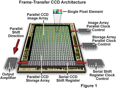 As presented in Figure 1, the storage array is illustrated as a large area of gray-scale "pixels" that have been covered with an opaque metal mask or light shield to prevent any potential interaction with incoming photons. A miniature portion of the total image is contained in each pixel element, which consists of four photodiodes masked with red, green, and blue colored filters. The image presented in the upper right-hand corner of Figure 1 is an actual high-magnification photomicrograph of a single pixel element. Like the full-frame architecture, the frame-transfer CCD undergoes readout by shifting rows of image information in a parallel fashion, one row at a time, to the serial shift register. The serial register then sequentially shifts each row of image information to an output amplifier as a serial data stream. The entire process is repeated until all rows of image data are transferred off the chip, first to a signal output amplifier and then to an analog-to-digital signal converter integrated circuit. Reconstruction of the image in a digital format yields the final photograph or photomicrograph.