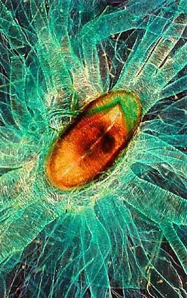 Tiny pieces of fragmented wood take on an unusually beautiful appearance when illuminated under darkfield conditions with a transmitted light microscope.