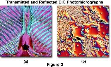 A downside is that plastic tissue culture vessels and other birefringent specimens yield confusing images in DIC, hence Hoffman modulation contrast is recommended for tissue culture work. Also, high-quality apochromatic objectives are now designed to be suitable for DIC. Figure 3 presents transmitted and reflected light DIC photomicrographs of the mouthparts of a blowfly (transmitted DIC; Figure 3(a)) and surface defects in a ferro-silicate alloy (reflected DIC; Figure 3(b)). Both photomicrographs were made using a retardation plate with a 10x objective.