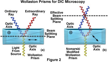 Start Tutorial »The plane-polarized light, vibrating only in one direction (East-West) perpendicular to the propagation direction of the light beam, enters the beam-splitting modified Wollaston prism and is split into two rays, vibrating perpendicular to each other. These two rays travel close together but in slightly different directions (see Figure 2). The rays intersect at the front focal plane of the condenser, where they pass traveling parallel and extremely close together with a slight path difference, but they are vibrating perpendicular to each other and are therefore unable to cause interference. The distance between the rays, called the shear, is so minute that it is less than the resolving ability of the objective.