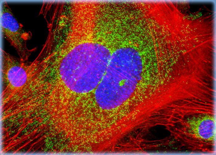A log phase culture of 3T3 cells was immunofluorescently labeled with primary anti-human golgin-97 mouse monoclonal antibodies followed by goat anti-mouse Fab fragments conjugated to Alexa Fluor 488 in order to target the Golgi apparatus. In addition, the cells were labeled with Alexa Fluor 568 conjugated to phalloidin for filamentous actin and Hoechst 33258 for DNA in cell nuclei.