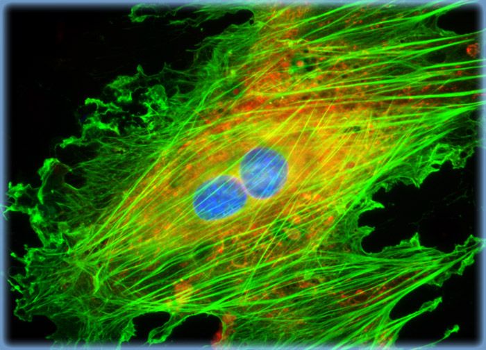 Rat thoracic aorta (A-10) cells were transfected with a chimeric EGFP plasmid vector that expresses a fluorescent fusion protein targeted at cytoplasmic actin. The fusion protein is incorporated into the growing actin filament network to enable visualization of actin-containing subcellular structures in living and fixed cells. The specimen illustrated in this section was also stained for mitochondria with MitoTracker Red CMXRos, and for DNA in the nucleus with the ultraviolet-absorbing probe DAPI.