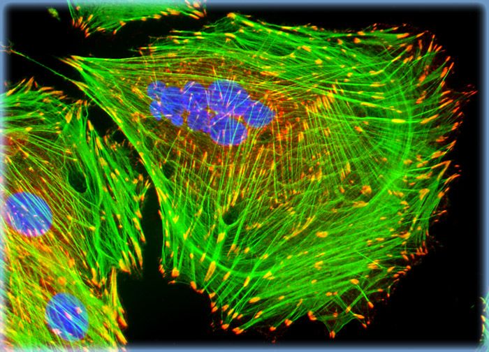 A culture of A-10 cells was immunofluorescently labeled with primary anti-vinculin mouse monoclonal antibodies followed by goat anti-mouse Fab fragments conjugated to Cy3 (red fluorescence emission). Note the prominent staining of the cellular attachment network in the central portion and periphery of these cells. In addition, the specimen was simultaneously stained for DNA with the ultraviolet-absorbing probe DAPI, and for the cytoskeletal filamentous actin network with Alexa Fluor 488 conjugated to phalloidin.